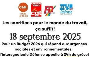 L'intersyndicale Défense et le syndicat CGT Arsenal de Brest appel à 24h de grève le 18 septembre 2025 l'ensemble des personnels du Ministère des Armées et ses établissements, de Naval Group et ses sous-traitants.